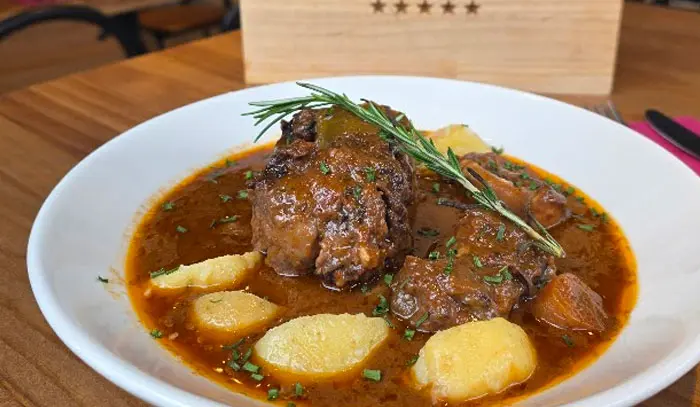 Rabo de toro cocido lentamente en su propia salsa, con un toque de vino y especias, servido con patatas doradas que absorben todo su sabor intenso y jugoso.