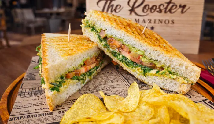 Exquisito sándwich vegetariano con humus cremoso, rúcula fresca, aguacate, tomate rebanado y salsa pesto. Una explosión de sabores.