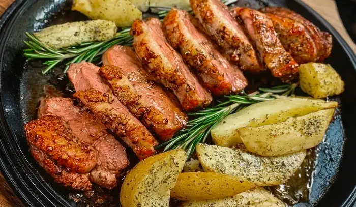 Magret de pato cocinado al punto justo, para potenciar su sabor intenso y jugoso. Se sirve acompañado de patatas al horno, tiernas por dentro y doradas por fuera, que complementan a la perfección la riqueza de la carne.